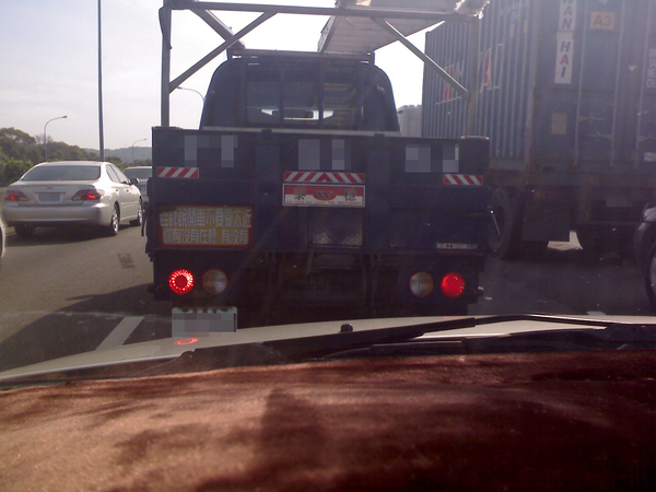 某天上班,北上經過南崁交流道的塞車路段,旁邊一輛貨車切到我前面,就看到他車尾掛了這個牌子,看清楚他寫什麼後,趕緊掏出我的相機拍下來XD。